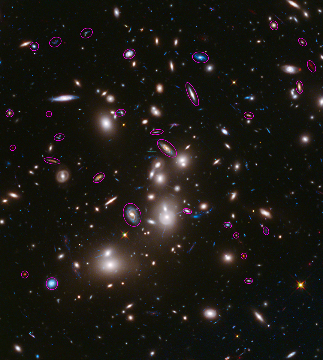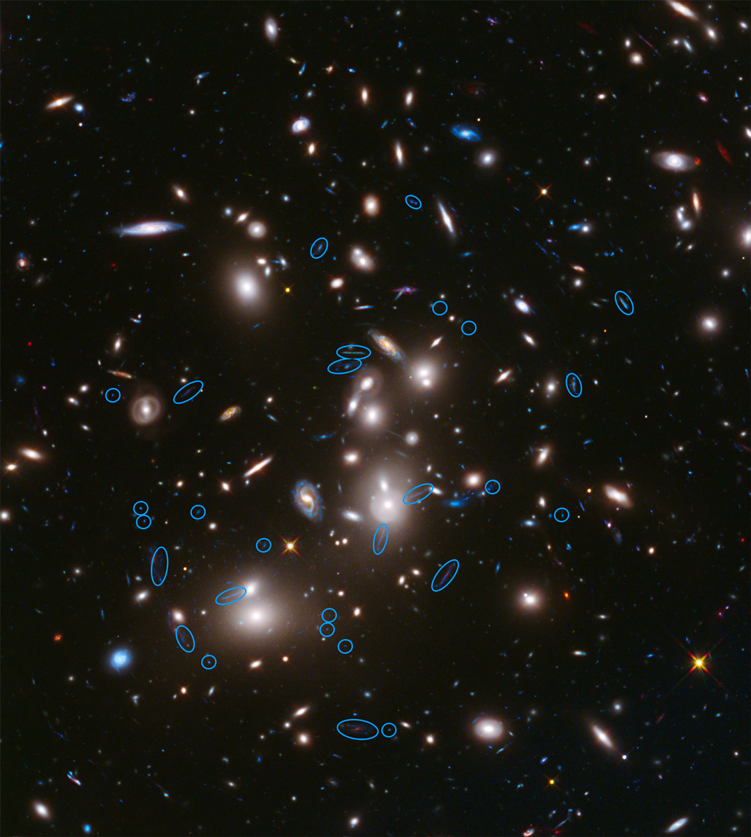 Now you’re seeing galaxies that are behind Abell 2744, and affected by the cluster’s gravitational lens. The light of these blue-circled galaxies is shining through the cluster, and is clearly distorted in many cases. In fact, many of these galaxies look like lines, streaks and arcs. They’re often concentrated along the same lines, and many of them have similar color schemes – blue with red patches.