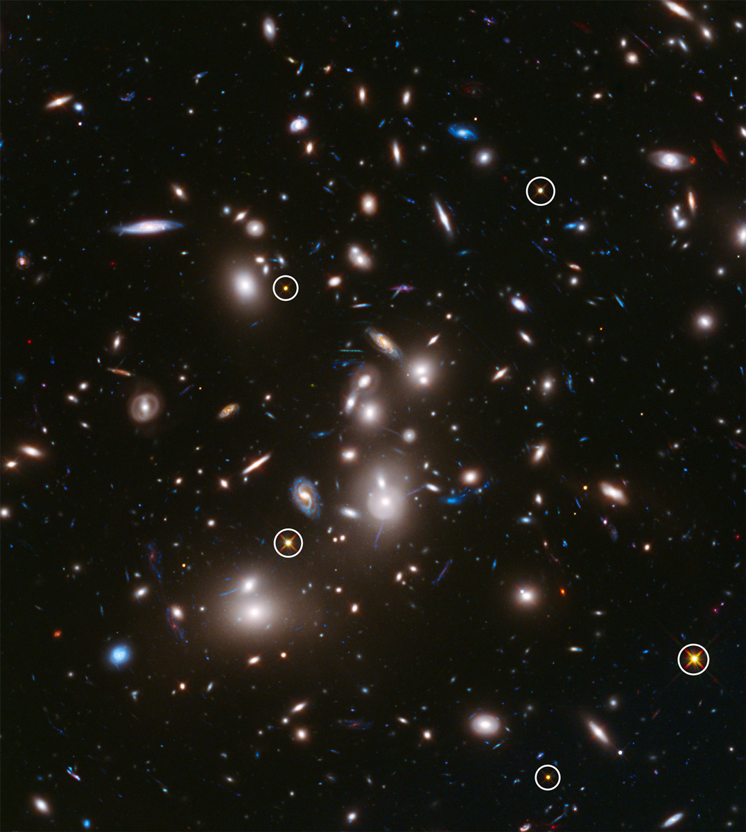 The tiny red specks circled here don’t look like much, but they’re actually some of the most intriguing objects in the image. These are the farthest and faintest of the galaxies being magnified by the gravitational lens. Their light could be reaching us from so far away that we see them as they appeared in the early universe – as far back as just millions of years after the Big Bang. (In a universe that’s 13.7 billion years old, that’s extremely far indeed.) One of these objects, Abell2744_Y1, is a candidate for being the most distant galaxy discovered in this image.