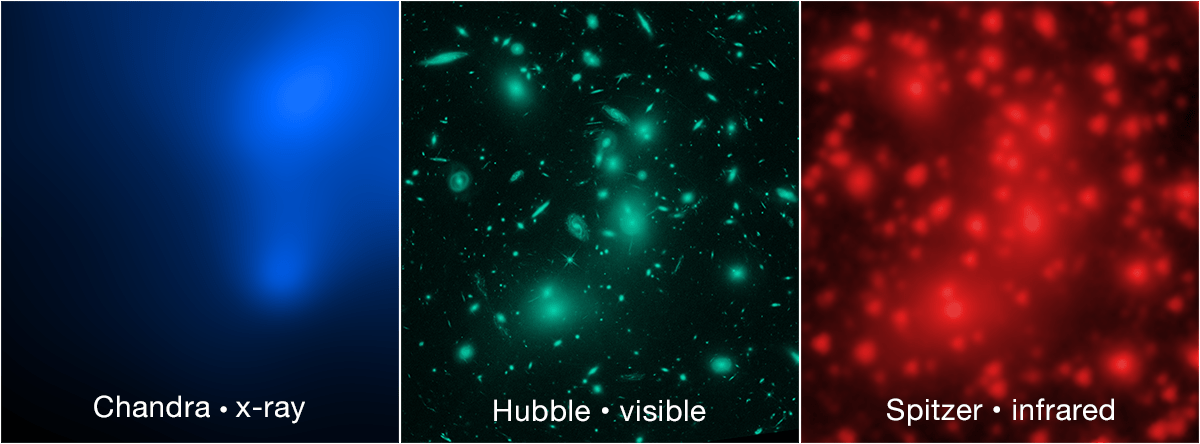 Processed images of galaxy cluster Abell 2744, with color added (X-ray light – blue, visible light – green, infrared light – red). Credit: Chandra – NASA/CXC/SAO; Hubble – NASA, ESA, and J. Lotz, M. Mountain, A. Koekemoer, and the HFF Team (STScI); Spitzer – NASA/JPL-Caltech/P. Capak