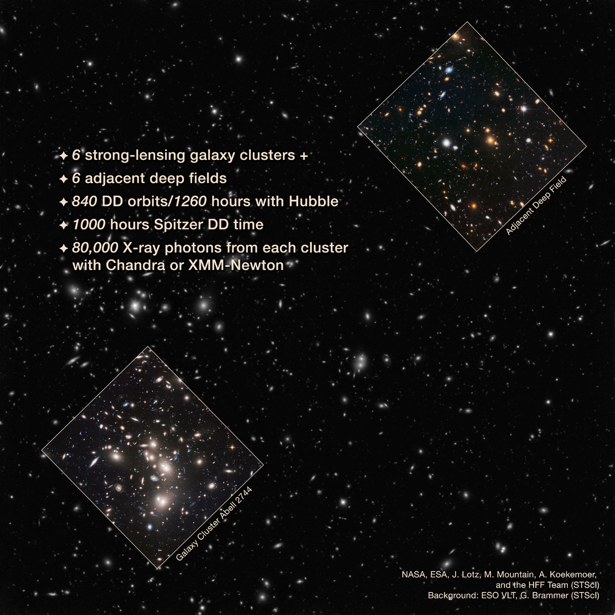 The observing plan of the NASA Frontier Fields program, using the galaxy cluster Abell 2744 and its adjacent parallel field as an example. Director’s Discretionary (DD) hours were allocated for Hubble and Spitzer observations. DD time comes directly from an observatory’s director, who has a set number of hours to allocate every year.