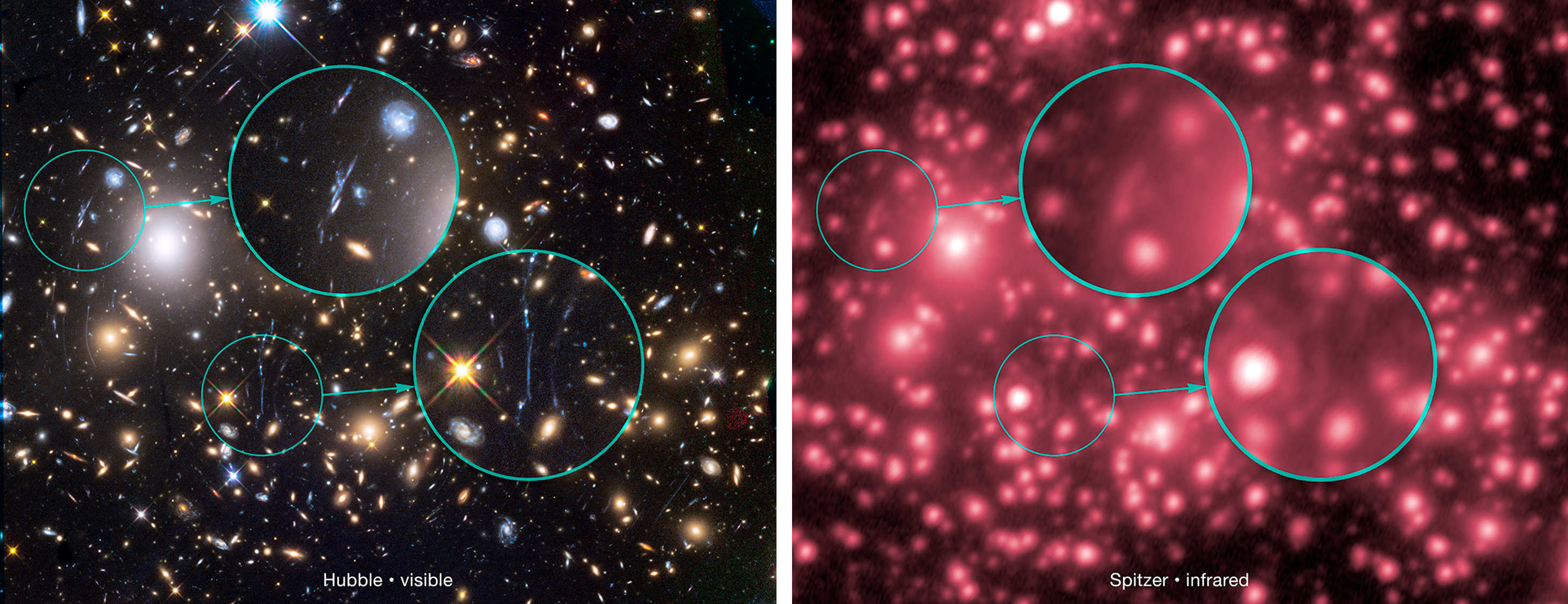 Shown here are gravitationally lensed galaxies in galaxy cluster MACS J0717, as observed by Hubble (left) and Spitzer (right). Credit: Hubble – NASA, ESA, and J. Lotz, M. Mountain, A. Koekemoer, and the HFF Team (STScI); Spitzer – NASA/JPL-Caltech/P. Capak